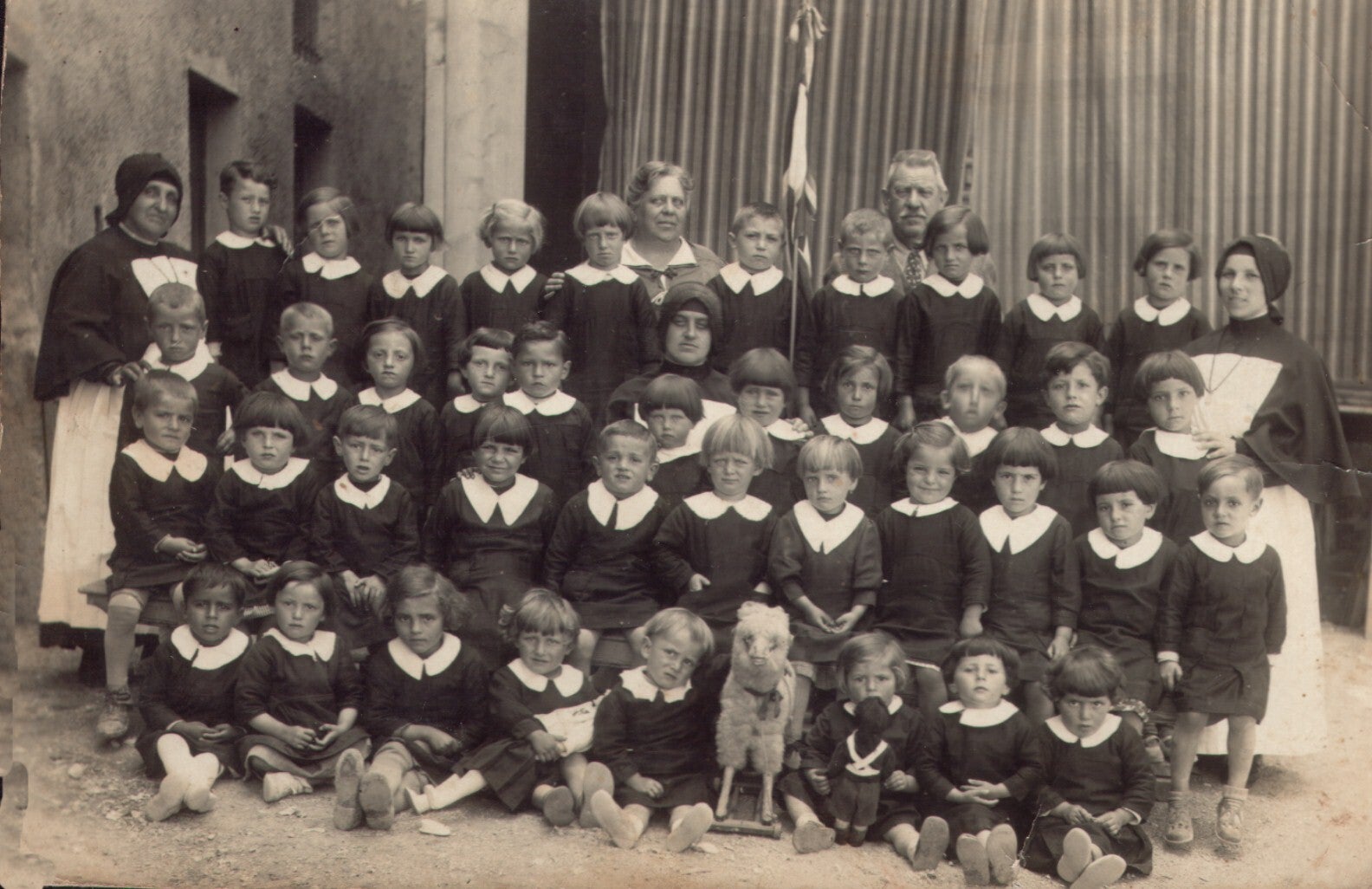 Le suore ci preparavano a un saggio — così facevano bella figura con la signora Cinica, una grassona con seno enorme, moglie del podestà. Erano scenette di guerra, nelle quali io ero disteso su una barella, con la fronte fasciata e sporca di sangue (intrisa di cornioli maturi). Al mio fianco, una crocerossina che mi assisteva (avevano scelto proprio la bambina che non mi piaceva!). Mi ricordo che dopo la recita ci fecero fare una mangiata di biscotti secchi, secchi. Il mio amico Nerio, un giorno che aveva preso la purga, non era riuscito neanche a calarsi i pantaloni: così era rimasto nel gabinetto pieno di dissenteria. Quando sono entrato, mi ha pregato di andare a chiamare la suora, che — amorevolmente — lo “defecò”! E il pranzo? Riso in brodo con le ortiche e acqua bollente. “La pasta minutina è fatta di farina” — così ci facevano cantare le suore. E se non la mangiavo… “Apri la bocca!” — e dentro un cucchiaio pieno da farmi venire il vomito. Per fortuna, a casa c’erano le tagliatelle della nonna per cena. Penso di chiudere qui il capitolo “Asilo”.
